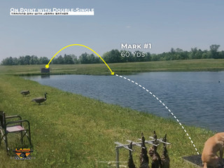 The first mark is starting in the handler’s left side. The mark flies left to right landing on the edge of the point at approximately 60 yards.